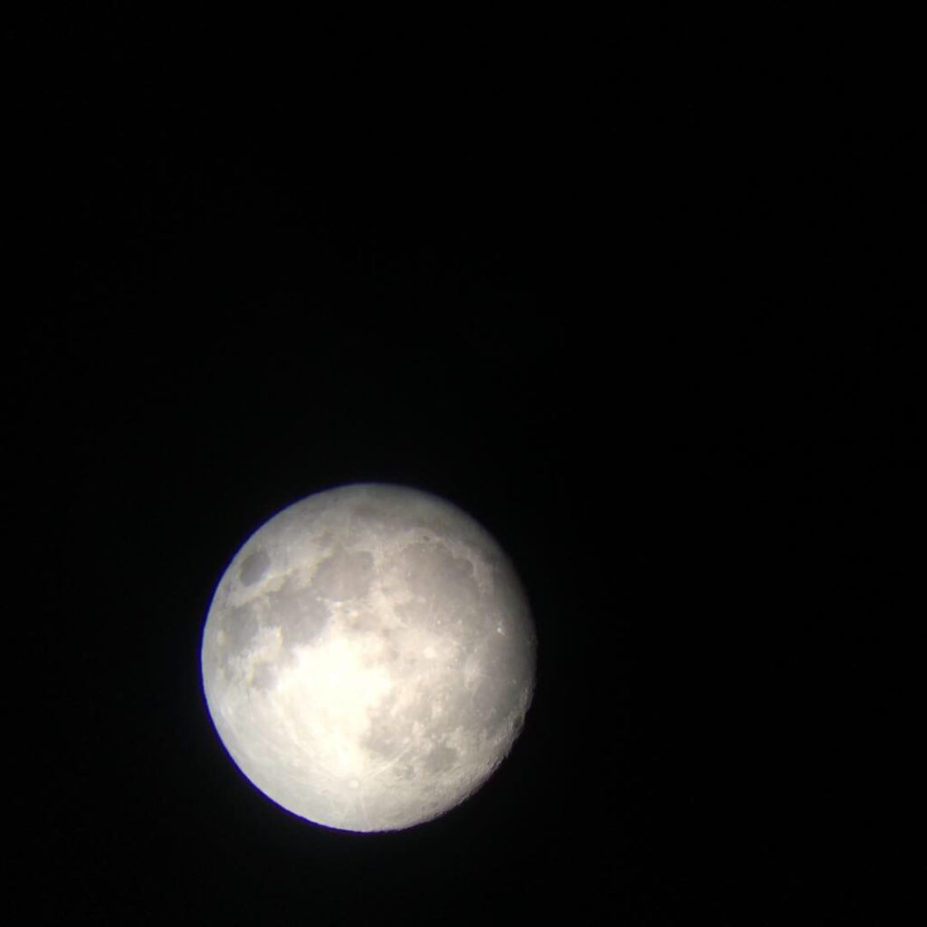 *我が家では今、天体観測ブームでして、今日のお月様をiphoneで撮ってみました。いや、正確に言うと天体望遠鏡のファインダーにiPhoneのレンズをあてて撮りました。