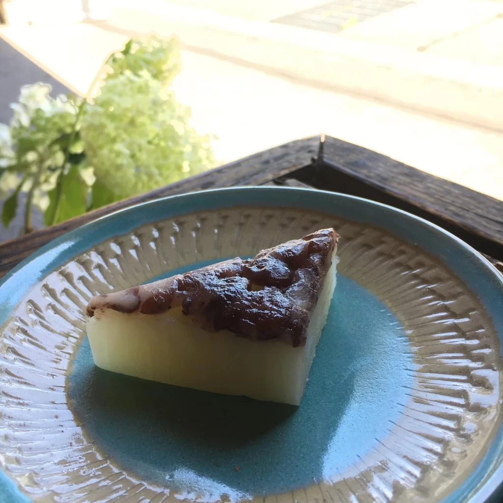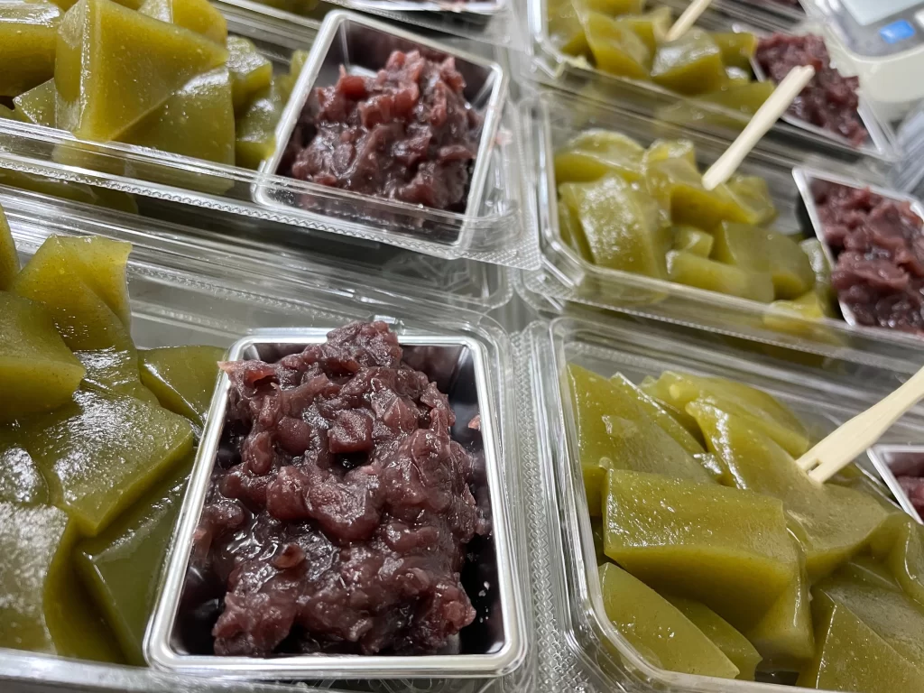 外郎(ういろう)の上に甘く煮た小豆を乗せて蒸し上げたもの