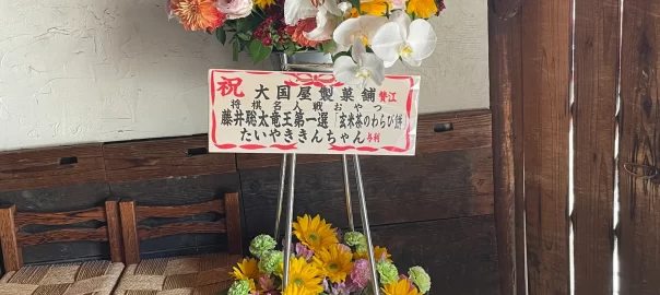 最近お店に来てくれた方は、ご覧になったかもしれませんが 店内にで〜っかい花輪が飾られています。 これは知人の瀬名のたい焼き屋さん「たい焼ききんちゃん」の Hさんが、この度の将棋のおやつコンテストのことで 贈ってくれたもの … 続きを読む 「たい焼き きんちゃん」の話