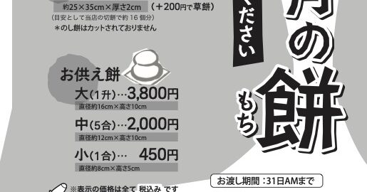 年内は、31日(金)まで営業致しますが 例年どおり、28日(火)より予約分の餅つき業務のみの営業となるため、 通常の和菓子は、売り切れ次第販売終了となりますのでご注意ください。 尚、年始は1月6日(木)より営業いたします … 続きを読む 年末年始の営業案内について