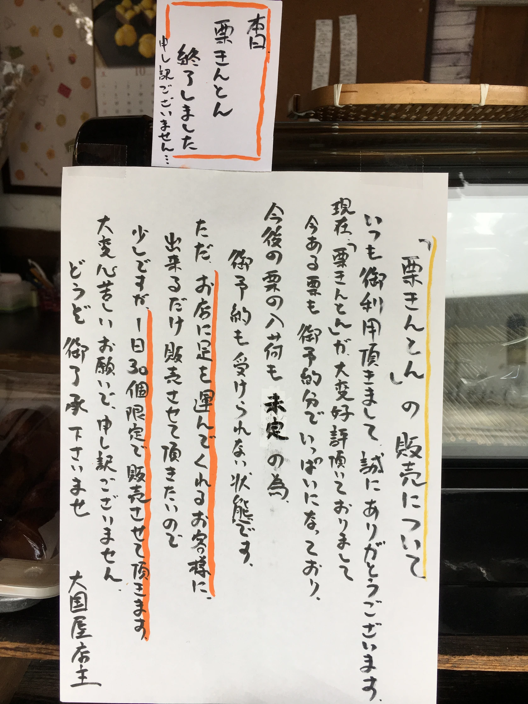 2018.10.24 「栗きんとん」の販売について いつもご利用頂きまして 誠にありがとうございます 先日のテレビ放送の影響もあり 現在ある栗もご予約でいっぱいになってしまいました…