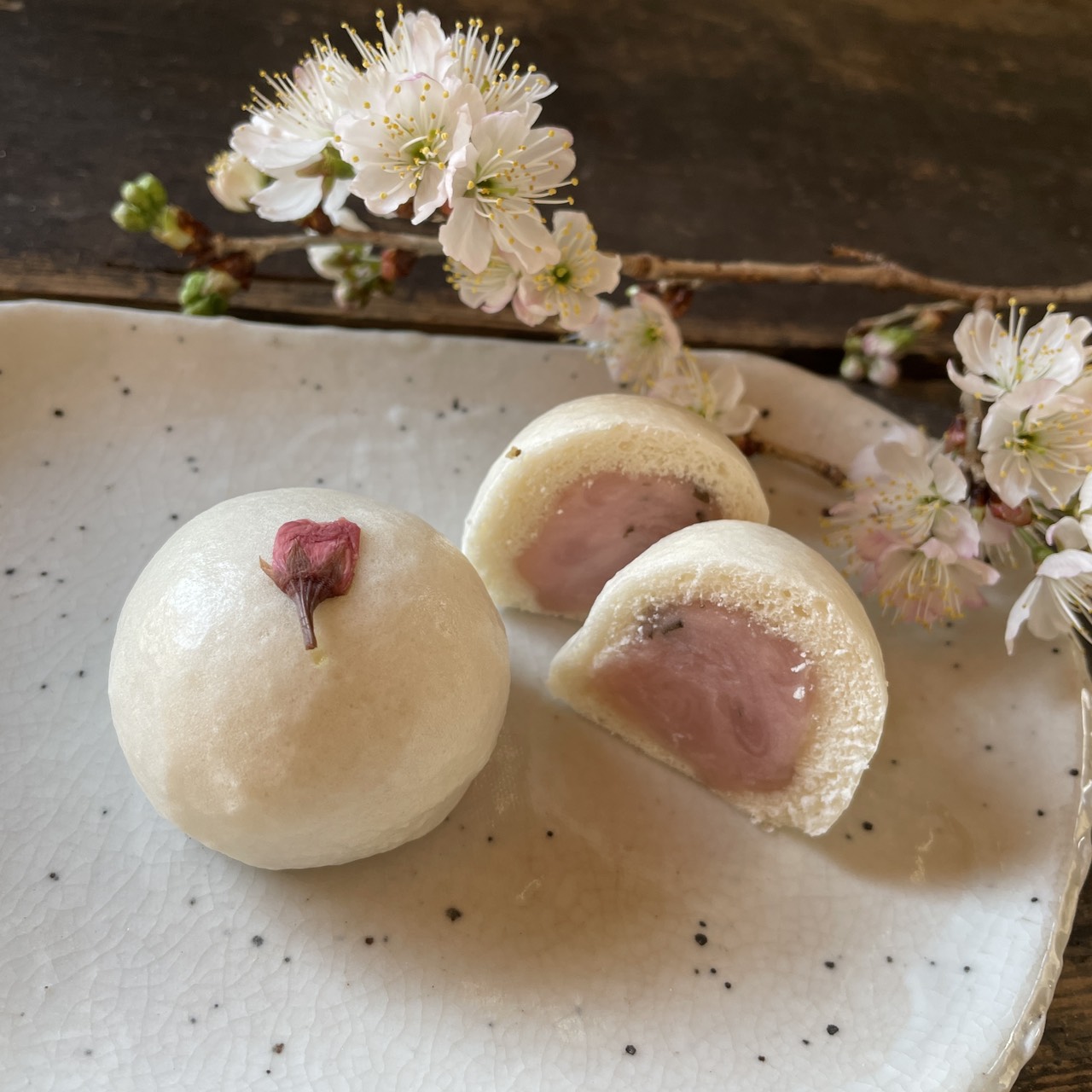 中は桜あん(刻んだ桜の葉を白餡に混ぜたもの)、上には桜の花(塩漬)を乗せてあり、春限定の可愛らしいおまんじゅうです。- 原材料